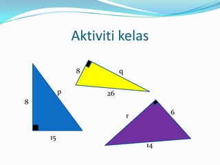 Segmen BC 15 m. Ia juga dikenali sebagai segitiga bersudut tegak british english. Sudut sisi kawasan semua jenis satu segi tiga.